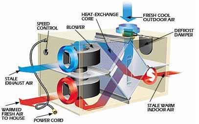 A residential heat-recovery ventilator uses separate blowers to move incoming fresh and outgoing stale air. The heat-exchange core transfers heat to fresh air without mixing the airstreams. The damper automatically stops cold air for defrosting.